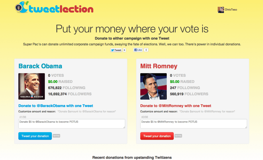 The company has also launched tweetlection.com, allowing donors to contribute to the Obama or Romney campaigns an amount of their choosing. The site will aggregate donor statistics for all to see and will notify the campaigns when contributions are made. If the campaigns establish an account, those donations will be immediately transferred.